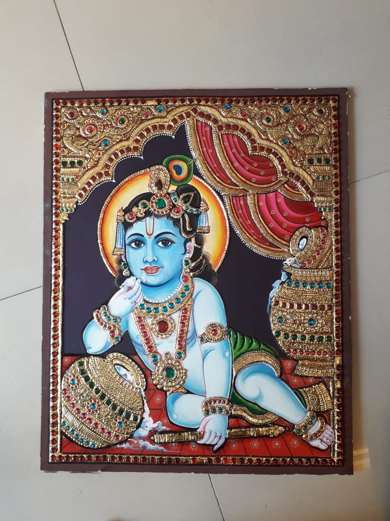 Lord Krishna's butter stealing or butter leela was a divine mischief in which he stole butter from the houses of Gopis and Yashoda Maa. It was not just a mischief, but a symbol of stealing love and devotion from the hearts of devotees and taking it to divine heightsCLARITY : Tanjore painting is taken with glass so its glaring, if you see directly it looks very beautiful than model picture!
