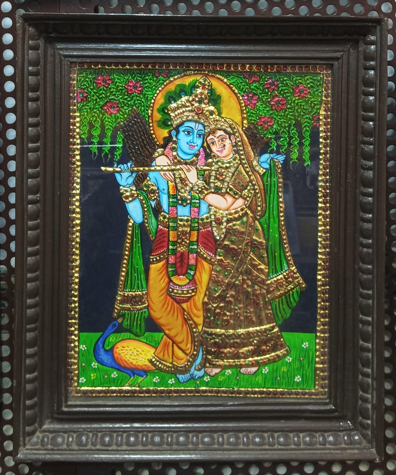 She is the goddess of love, tenderness, compassion, and devotion. In scriptures, Radha is mentioned as the avatar of Lakshmi and also as the Mūlaprakriti, the Supreme goddess, who is the feminine counterpart and internal potency (hladini shakti) of Krishna. Radha accompanies Krishna in all his incarnations.    CLARITY : Tanjore painting is taken with glass so its glaring, if you see directly it looks very beautiful than model picture!