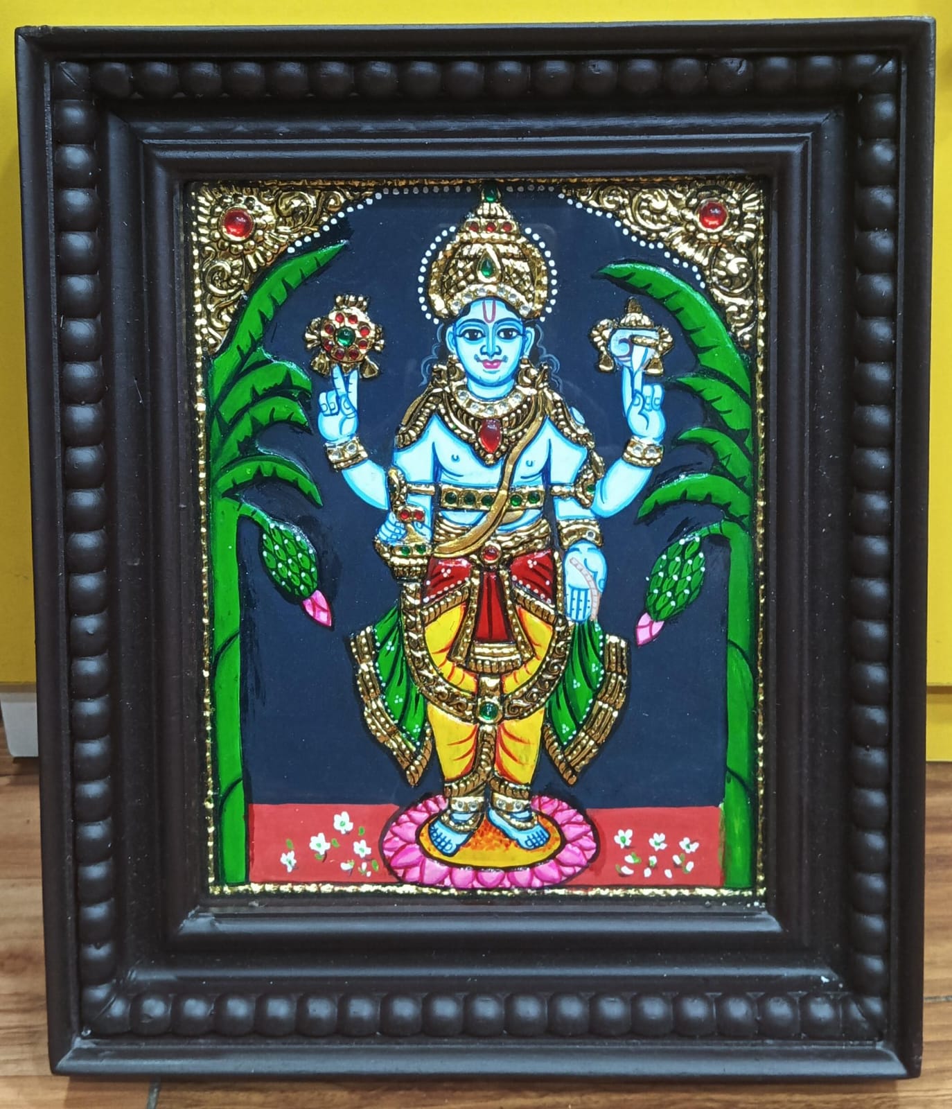 Lord Satyanarayan is a form of the Hindu deity Lord Vishnu, considered the embodiment of truthThe name is a combination of "Satya" (truth) and "Narayana" (the highest being or supreme deity). He is worshipped for blessings of prosperity, success, and protection.   CLARITY : Tanjore painting is taken with glass so its glaring, if you see directly it looks very beautiful than model picture!