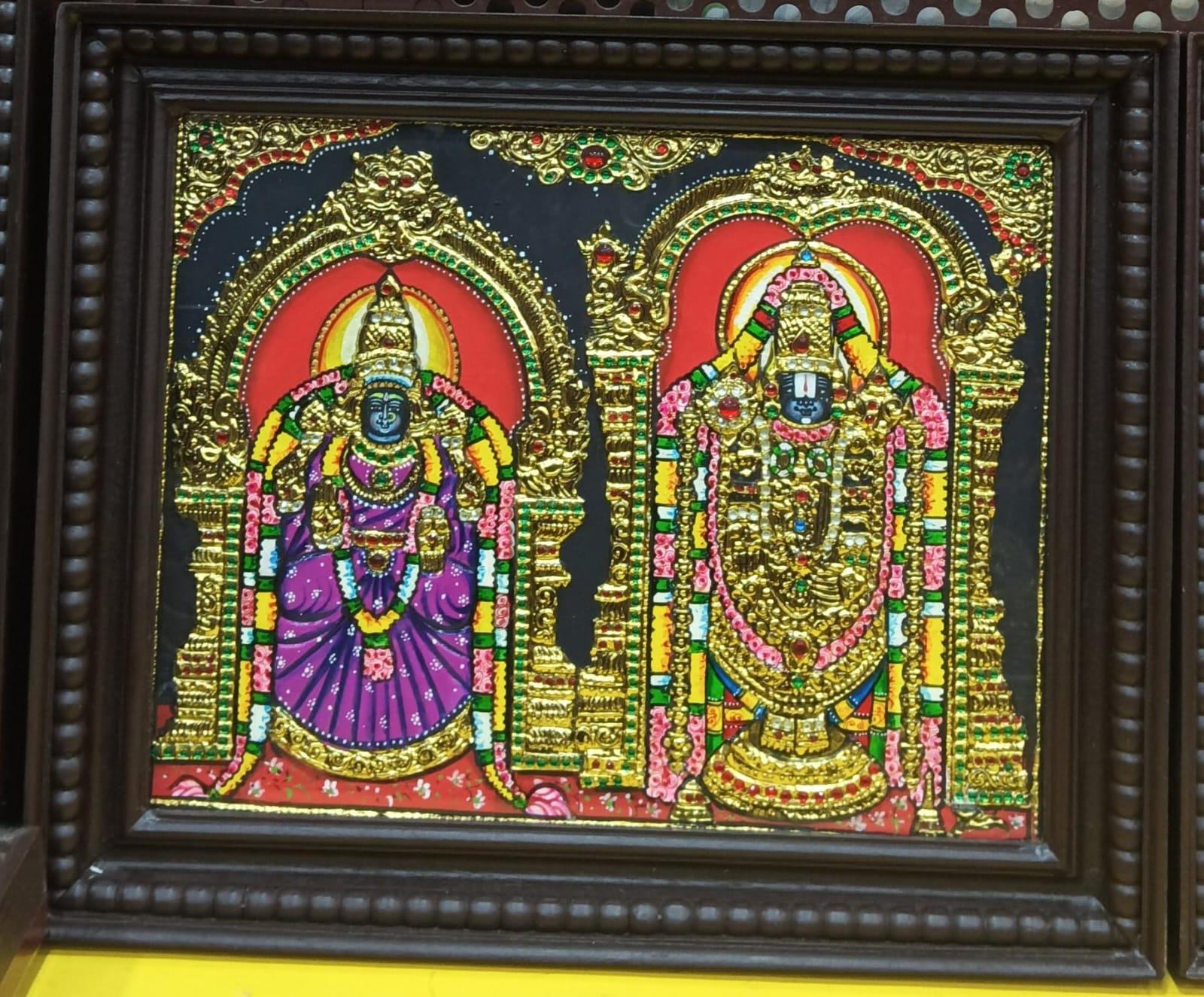 "Thayar Balaji God" refers to the divine couple of Lord Balaji (Venkateswara/Vishnu) and his consort, Goddess Thayar (Lakshmi/Padmavati), worshipped together, especially in South Indian Vaishnavism, representing the complete grace, prosperity (Lakshmi), and divine protection (Vishnu) in one unified form, symbolizing ultimate spiritual and material fulfillment. Worshipping them together, as seen in the iconic Tirupati Balaji temple, ensures blessings, wealth, success, and removal of obstacles. CLARITY : Tanjore painting is taken with glass so its glaring, if you see directly it looks very beautiful than model picture!